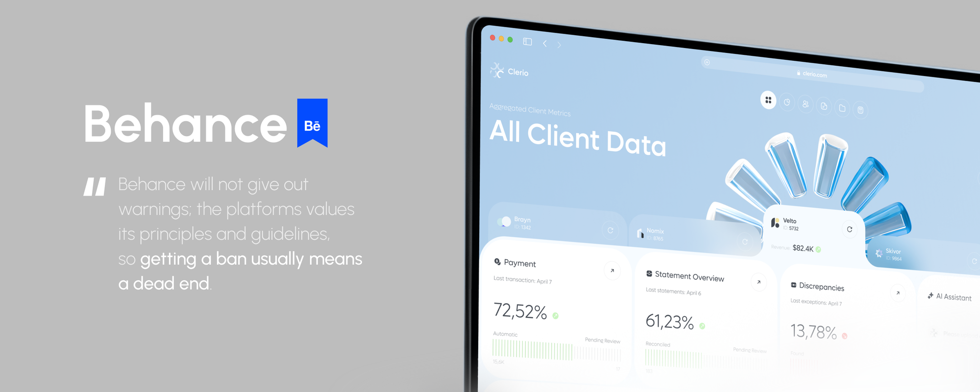 Unlike Dribbble, Behance does not welcome third-party sharing and traffic, and will look closely at cases that show certain statistics about the source of engagement. It goes as far as banning established accounts at the least bit of doubt, so you as a creator must be highly aware of how you promote your work from Behance.
